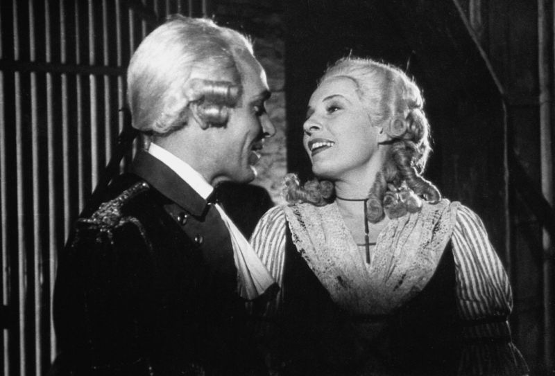 The film opens in early 1933 with a theater performance of Friedrich Schiller’s “Intrigue and Love” (Kable und Liebe, 1784), staring Elisabeth Maurer and Hans Wieland. The Jewish actress is blacklisted shortly thereafter, and inexplicably, the “Aryan” Wieland marries her in the belief that he can protect her. Hans, initially the second fiddle to her star, continues his upwardly mobile career in Nazi Germany, even though a Jewish colleague strongly suggests the couple emigrate. Flash forward to the days before the November 1938 pogroms: His career is going gang-busters, while Elisabeth is suffering from intense isolation; unable to appear in public, she expresses doubts about their marriage, but he again dissuades her from emigrating. Like her Jewish former costume assistant, she spends days at the Nazi Mixed Marriages Bureau, applying for ration cards. The film’s last third takes place in 1943 when Elisabeth is ordered to hard labor, and Jews are being deported “to the East.” Hans talks her into attending the premiere of his newest film, ostensibly to cheer her up, where she charms a high-ranking Nazi, who is unaware of her status. When he finds out, he orders her deportation, and the couple commit double suicide.