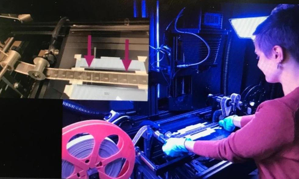 In any case, what film historians saw over the next fifty years from that early period were often dupey 16mm prints from the Niver collection. Now, two L. Jeffrey Selznick School graduates, Meghan Holly and Erin Palombi, have begun digitizing these invaluable documents of film history. In explicating the restoration process, the archivists note that after placing rolls on plastic cores and in acid-free archival boxes, they prepare the rolls for scanning, by removing all extraneous objects, dirt, then repairing tears, using heat-set tissue, which is a long-fibered repair tissue that activates between 176°F and 194°F. The tissue is coated on one side with an acrylic adhesive, allowing the tissue to be attached to the non-emulsion side of the paper, allowing the rolls to be automatically advanced through the scanner.