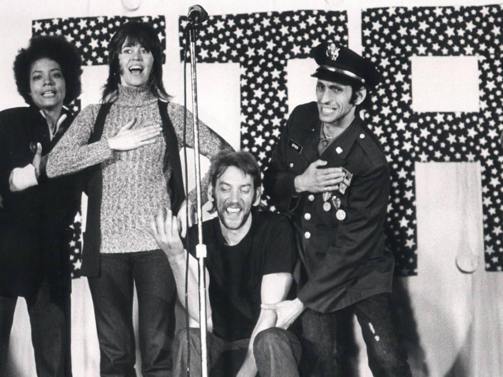 Shot in a raw, off-the-cuff style in 16mm, the stage show starred Jane Fonda and Donald Sutherland, as well as Peter Boyle, Holly Near, Michael Alaimo, Rita Martinson, Len Chandler, and others. In various combinations the actors present skits and sing anti-war songs, with Fonda at one point calling a Vietnam battle as if it were a sports event, while Donald Sutherland at another point reads a passage from Dalton Trumbo’s novel of a World War I quadruple amputee, blinded survivor, Johnny Got His Gun (1939). Like the show itself, the film is a bit disjointed, but certainly reflects the passions and energy of the times. At two points the camera strays to capture militant Okinawan, anti-military occupation protestors and a Filipino pro-democracy rally, suggesting that the American left’s struggle is part of a larger struggle of Third World people, a common rhetorical trope. One of the dramatic high points comes when the troupe is denied entry to Japan, because they have tourist visas, but are planning to perform, i.e. work.