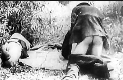 The Filmoteca’s earliest French pornographic film is A L’Ecu d’Or ou la bonne auberge / At the Golden Shield or the Good Inn from 1908, which survived in a 9.5 mm copy. Unfortunately, many of the earliest films from the turn of the 20th century no longer survive, because the Filmoteca for decades did not have climate-controlled vaults, leading to nitrate decomposition, including as paper records indicate, close to 100 films, produced in the brothels of Buenos Aires and exported to Europe to be shown at stag parties, or what the Germans called “Herrenabende.” One Argentine film that has survived is El Satario / The Satyr, which may have been produced as early as 1907.Besides the French, who specialized gay and straight porn, sometimes in the same film, the Austrians and Germans were big producers. Another gem in the collection of the Filmoteca de Pape is Am Abend, a ten minute German film from 1910.