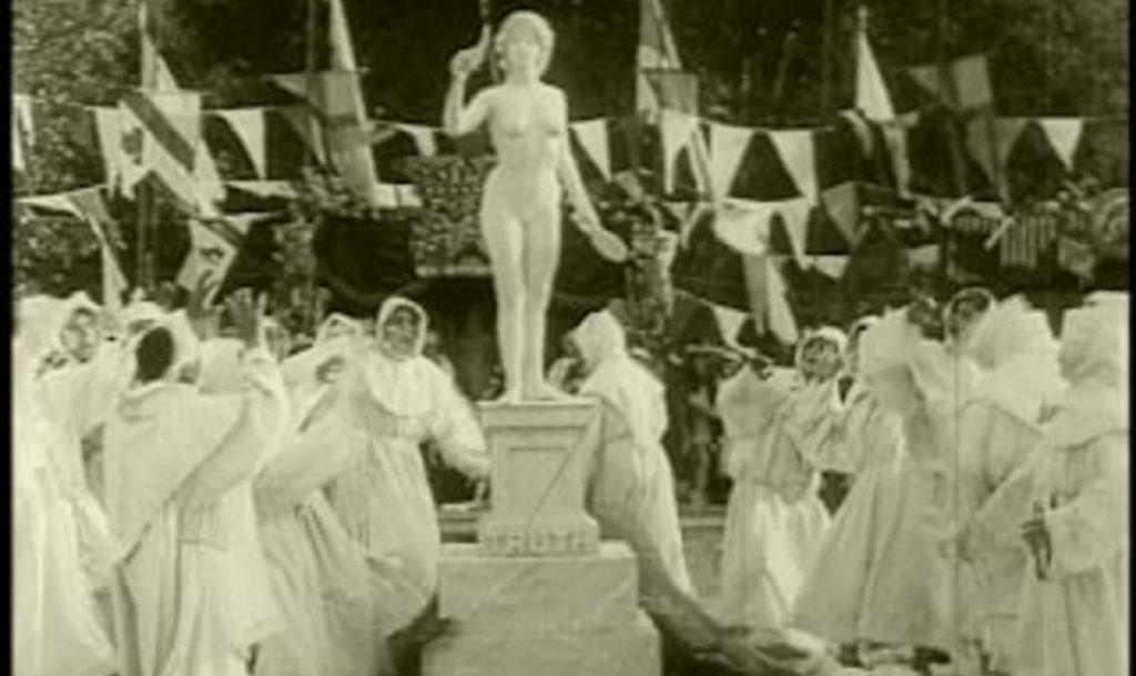 Given its convoluted structure, film historians and critics for decades discussed Lois Weber’s film not only as an allegory but as a film that defies the conventions of what was to become known as classical Hollywood narrative. An original print of Hypocrites had been discovered in the 1970s at the National Film and Sound Archive in Australia and was repatriated to the Library of Congress’s American Film Institute Collection. That tinted version, which is available on YouTube was considered definitive. It opens with an allegorical image of a female nude walking through “the gate of truth,” then cuts to the minister Gabriel preaching to his congregation; after reading a newspaper article about a statue in Paris representing “Truth” that had been censored, he imagines himself a Benedictine monk who unsuccessfully leads his parishioners up a steep path of virtue, another allegorical scene. The film then flashes back to medieval times in the third reel where the monk has created a sculpture of a nude female depicting “the truth,” and is killed by an angry mob for blasphemy. The fourth reel has “the naked Truth” holding up a mirror to contemporary politics, society, etc., thus visualizing the congregation’s hypocrisy, before returning to the church where the minister expires.