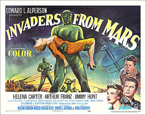 Invaders from Mars (1953) was directed by William Cameron Menzies, an art director of such classics as The Thief of Bagdad (1924) and Gone with the Wind (1939), who had occasionally directed films, like H.G. Well’s Things to Come (1934). Edward L. Alperson, who had worked as an independent B-film producer since the mid-1930s, financed the film, which starred Helena Carter, Arthur Franz, and Jimmy Hunt as the 10-year-old hero. Made at the height of the flying saucer scare, the film theorizes that a Martian spaceship lands in America, kidnap Americans, and turns them into slaves by inserting a pin-sized receiver in their brain stem. The boy observes the flying saucer land but has trouble convincing any adults, including his own parents who soon turn against him because they are under the control of the aliens. Like other sci-fi films, including The Invasion of the Body Snatchers (1956), whose very title describes Invasion from Mars, the film metaphorically works through the dual traumas of a Communist infiltration – ordinary humans becoming malevolent social actors – and parental abandonment of children.