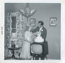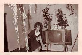 While television sets, their size, and their color capability, became a sign of affluence as the 1950s progressed, Spigel argues that consumers also used them to inhabit a space of resistance to a culture of conspicuous consumption and its prescriptions. Indeed, the television quickly became a household object integrated into the homes and lives of almost all Americans, where “people arranged and photographed the tv set in relation to other household activities and things.” (p. 28) TV snapshots not only documented a family’s technical proficiency in operating the new media tool but also “enact(ed) their relationships with each other through their mutual engagement with the new tv.” (p. 32) While images of families or just children watching tv are common, many more show families engaged in other social activities in front of the television, whether holiday parties, even weddings, reading, or playing games. For example, Christmas trees were often placed in close proximity to or even on the television set, setting the stage for the holidays. For African-Americans and other ethnic minorities, the television was a particularly ambiguous object, since on tv they were either invisible or portrayed in racist terms, but tv allowed them to perform their real identities in front of the set.