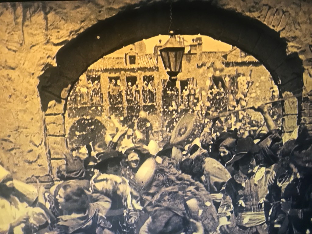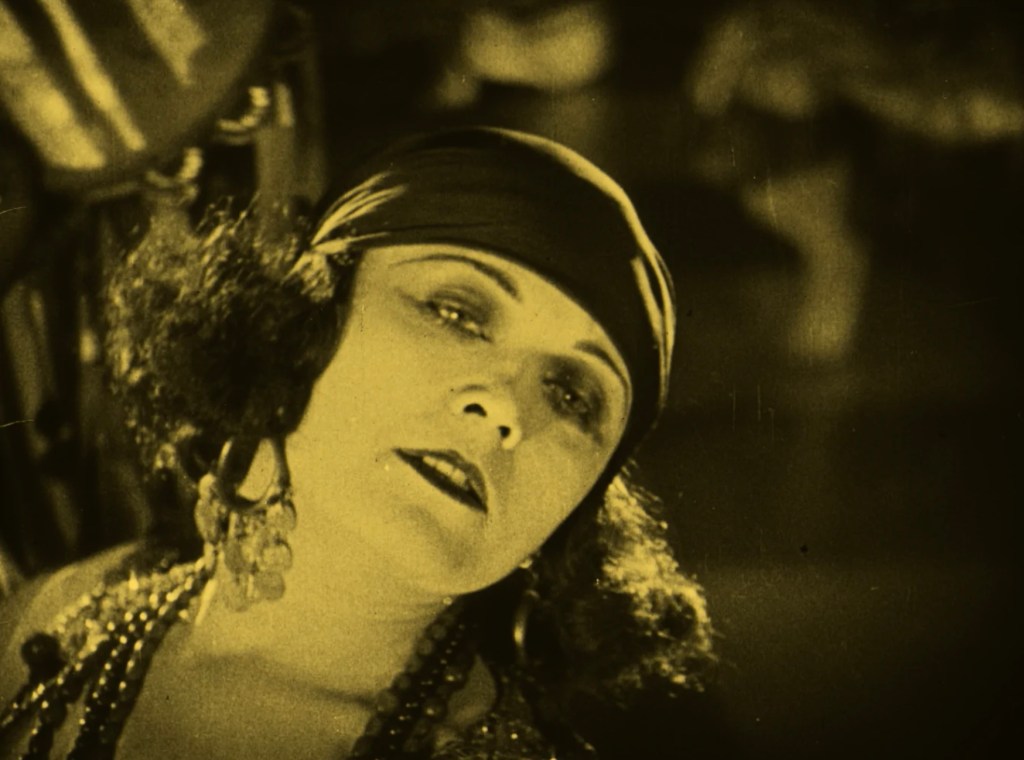 The pleasure of the film lies not so much in the conventional plot as Brenon’s ability to integrate monstrous sets and massive crowds with more intimate proceedings. Brenon loves to frame his crowd scenes with architectural details, for example, cutting between Roma dancers in a huge hall, framed by Gothic arches, and Negri reading the cards for Don Caesar. The Mardi Gras scenes in Madrid’s town square show literally thousands of revelers, dancing, and singing in what appears to be utter chaos, yet Brenon manages to focus viewer attention on Don Caesar saving a young boy from the captain of the guard. And finally, it is Negri’s star presence, visibly playing off her Roma roles in Lubitsch’s Carmen (1918) and The Wildcat (1921) as a passionate, unbridled, sexual being, which sold her to American audiences, making her an undisputed star, second only to Mary Pickford.