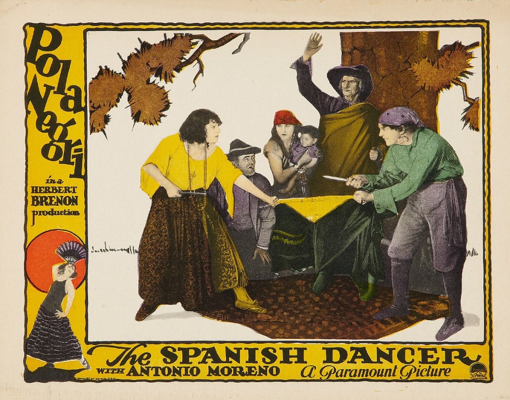 I first saw Herbert Brenon’s The Spanish Dancer (1923) in 1996 at the Giornate del Cinema Muto, when the Festival presented a mini-retrospective, “A Kiss for Herbert Brenon.” I had first discovered la Negri in her German films with Ernst Lubitsch, most of which I watched on a Steenbeck at the Deutsche Kinemathek in Berlin in 1974, the Summer I was researching my master’s thesis on Ernst Lubitsch and the Rise of Ufa. A year later as an intern at Eastman Museum, I fell in love with many of her American films, in particular Forbidden Paradise (reunited with Lubitsch), A Woman of the World (1925), Hotel Imperial (1927), and Barbed Wire (1937). My boss, Jim Card, was also a big fan of Pola’s – he had a thing for dark-haired actresses: Louise Brooks, Eleonore Powell, Sybille Schmitz. – and showed me Willi Forst’s Mazurka (1935), an Austrian production where Negri spoke and sang German. With Lubitsch, but also with American directors, Pola Negri exuded an exotic sensuality, her wild dark hair promising passion without restraint.