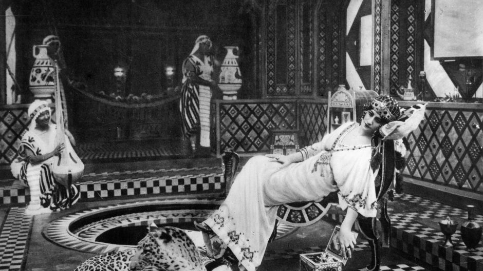 Giovanni Pastrone’s Cabiria (1914), which Blom considers “the apex of the historical genre in early Italian cinema” (p. 169), likewise, gives evidence of a rich iconography from previous sources, including the illustrations by Georges-Antoine Rochegrosse for the 1900 edition of Gustave Flaubert’s 1862 novel, Salammbô. Blom zeroes in on two set pieces, the Temple of the Moloch and the boudoir Sophonisba, both also described by Flaubert, to demonstrate how their iconography originated in earlier 19th-century sources, including paintings and opera stagings. Apparently, more than sixty “academic” paintings took their themes from Flaubert’s Salammbô. Georges-Antoine Rochegrosse’s Salammbô et les colombes (1895) functioned as a model for Sophonisba’s boudoir, while numerous other illustrations by the painter were also referenced in Cabiria.