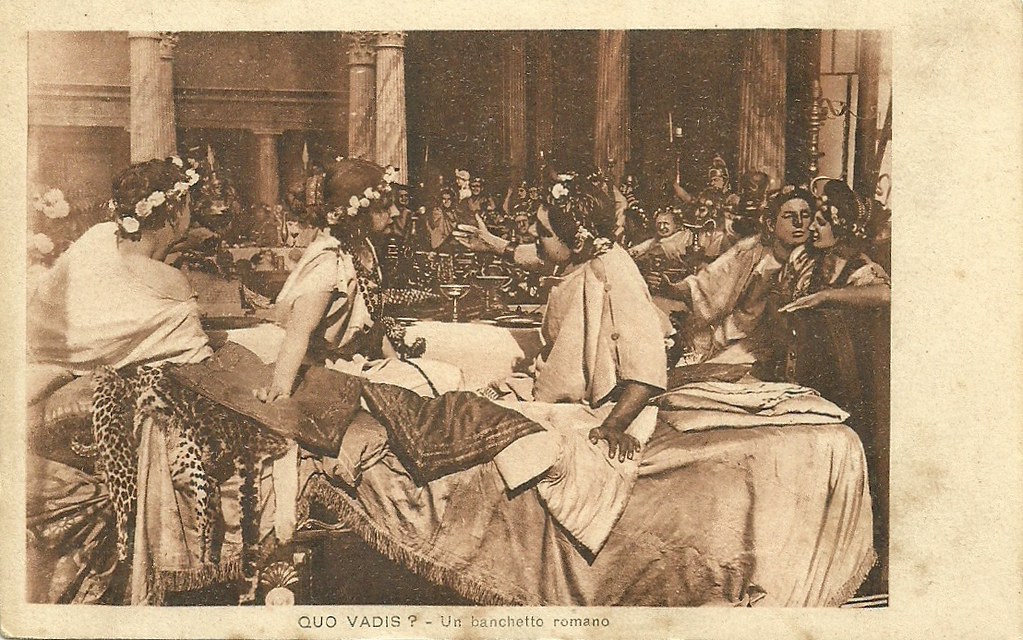Another major influence on Guazzoni’s Quo Vadis was the paintings of Alma-Tadema in terms of staging, and “particularly the use of props and deep staging.” (p. 108) Like other painters of antiquity, Alma-Tadema made use of actual archeological objects from Roman times, especially furniture and other props. which then entered into the visual vocabulary of Guazzoni’s film and other Italian epics. Alma-Tadema’s composition in deep space also became a visual feature in many Italian silent epics, which layered space through set elements like curtains and stairs.