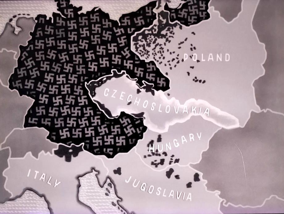 But all Czech efforts are for naught when Chamberlain negotiates with Hitler without the participation of the Czechs, forcing President Beneš to resign. Crisis ends with an uncertain almost elegiac note with the sanctioned occupation of the border regions and the title: “Remember: Peace and freedom and the right to live – they can only be possible in lands where men are determined that the swastika shall not be raised in triumph…”
