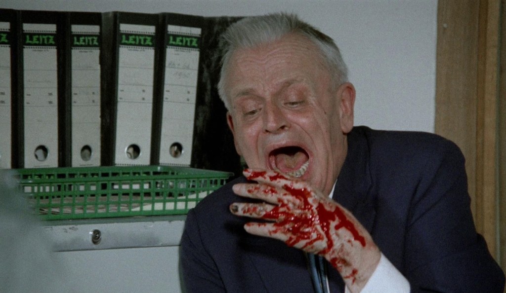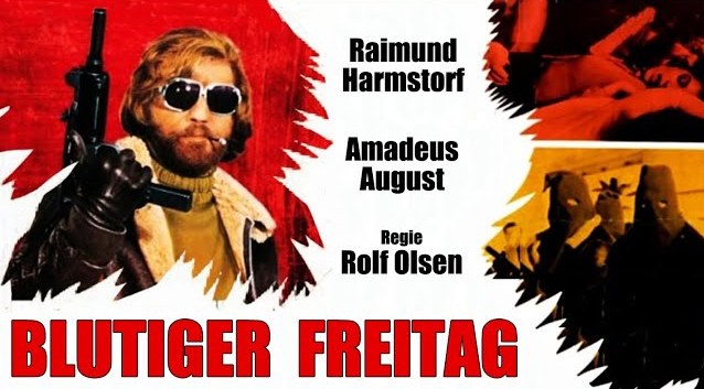 Bloody Friday (1972, Rolf Olsen), a German-Italian co-production, takes violence and blood-letting to the extreme, in keeping with Giallo genre aesthetics. A violent criminal escapes from custody, organizing a bank robbery with two accomplices in a suburban Munich bank that includes taking hostages to guarantee their getaway, after stealing weapons from a U.S. Army transport. The bearded gang leader kills indiscriminately, drinks on the job and rapes a hostage he accuses of being a lesbian. Meanwhile, the police are under massive pressure because one of the hostages is the daughter of a rich industrialist. In the end, the robbers either shoot each other or are gunned down by the police when they hole up in a deserted Bavarian tavern.