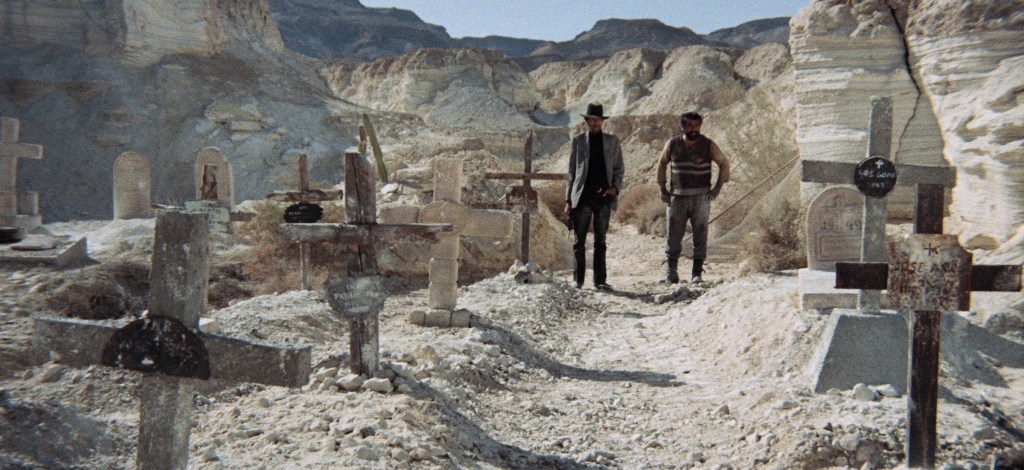 Deadlock (1970, Roland Klick) opens with a wounded man carrying a suitcase full of cash through the desert, while Can’s avant-garde Krautrock blares on the soundtrack, mocking Ennio Morricone; the hero faints just before an old pickup rumbles into the scene, its decrepent occupant taking the bank robber to an abandoned mining town. When the robber’s accomplice shows up, an extended and deadly cat-and-mouse game ensues between the three men to make off with the cash, ending with the death of two (innocent) women and two men. An anti-Western of stasis rather than action, however, without a carefully set-up final duel.