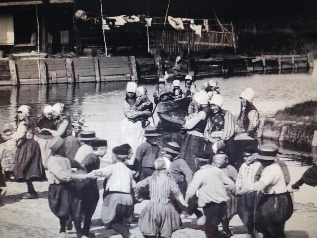 What we would now term anthropological scenes were also popular, depicting images of daily life, like an encampment of Roma (1898), the women cooking over open fires, while the men pose for the camera, or Dickson and his family in Venice’s St. Mark’s Square, feeding pidgeons, while his toddler runs in and out of frame. There are also memorable events, e.g., a funeral in Rome (1898), the casket of the departed and the mourners shrouded in black hoods, or a London fire brigade leaving the station (1899), a very popular motif memorialized later in Porter’s Life of an American Fireman (1902). Other scenes reveal Hungarian peasants drinking at a pub, Italian peasants dancing the tarantella, or Dutch children from the Island of Marken at play. Given the large format and also the conventions of the time, close-ups were non-existent, although on occasion the camera will be close enough to reveal details on faces, as in a scene of a procession of Capuchin monks in the Vatican.
